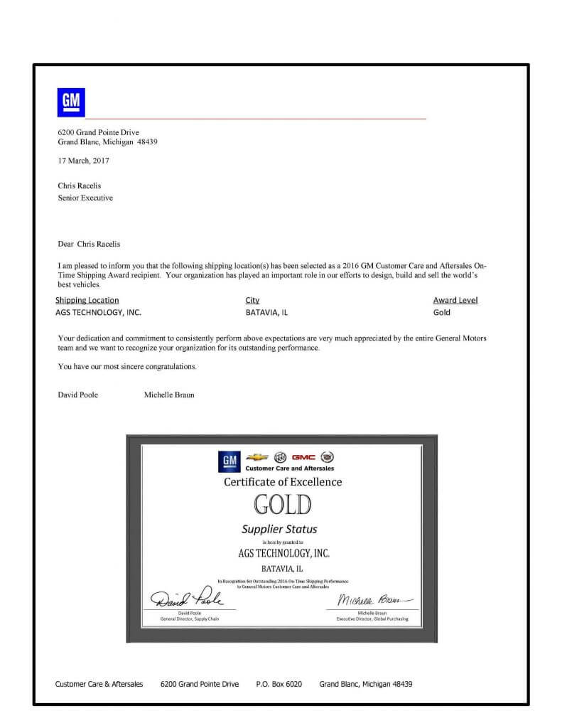 For calendar year 2016, General Motors has once again recognized AGS Technology with a “Gold Supplier Status” plaque for its outstanding on-time delivery performance. Everyone at AGS Technology is proud of their role in helping General Motors design, build and sell the world’s best vehicles.