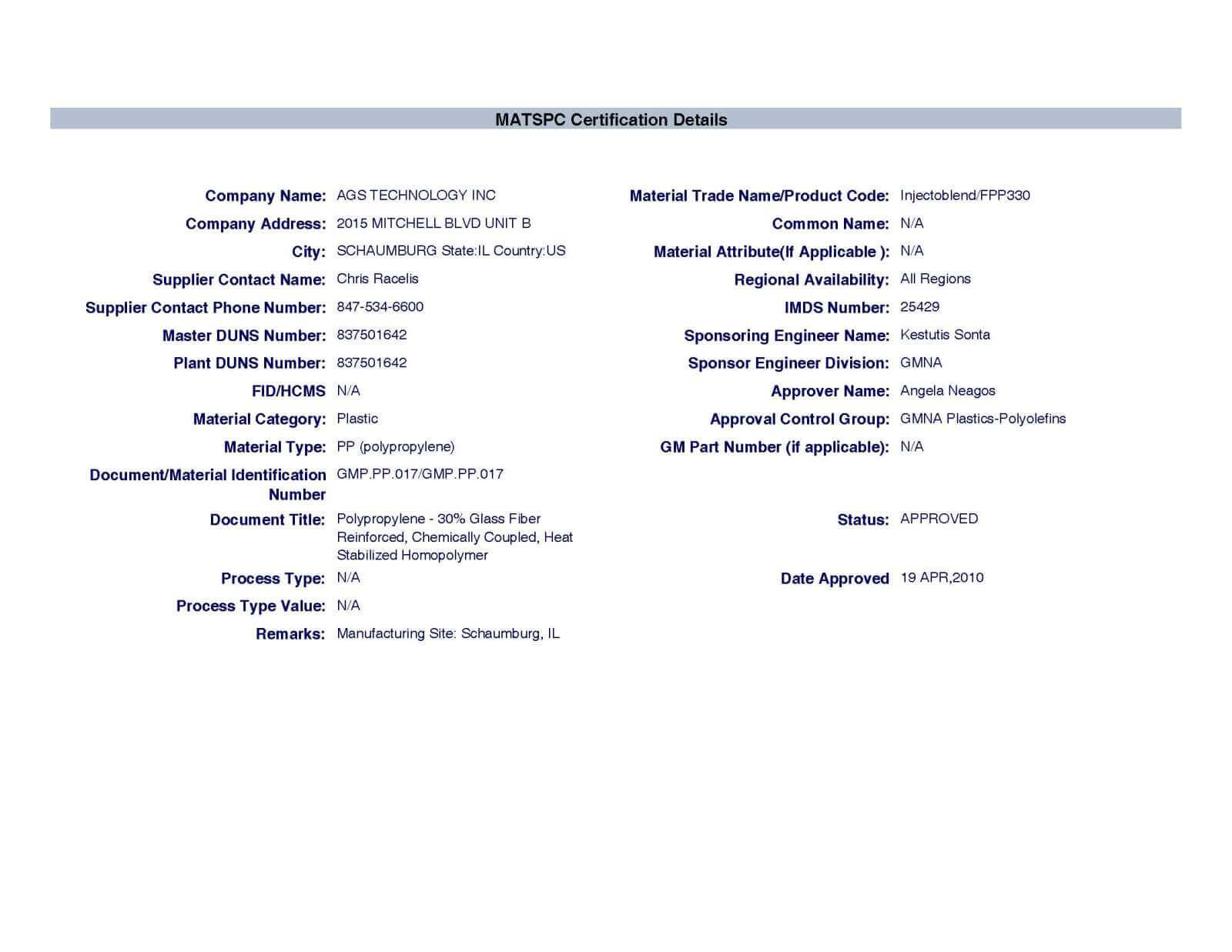 General Motors Material Engineering has approved AGS Injectoblend FPP330 to GMP.PP.017 specification. FPP330 is a 30% glass reinforced polypropylene that is used for various under-the-hood, exterior, and interior parts. Examples include headlamp mounting brackets, armrest substrates, shields, battery trays, BCM/ECM/PCM/TCM/TCCM/VCM brackets, spare tire adapters, door belt reinforcements, etc… This approval introduces a cost-effective recycled alternative to virgin materials for new and existing GM molds. For more information contact George Staniulis at (847) 534-6600 x102.