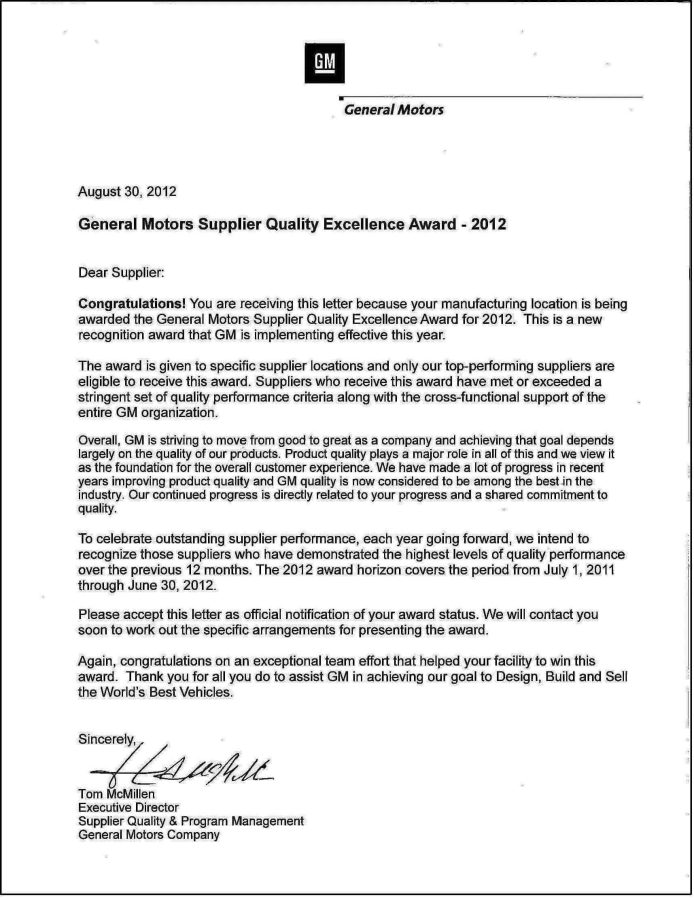 On August 30th, General Motors notified AGS Technology that it was being awarded the General Motors Supplier Quality Excellence Award for 2012. This recognition was based on AGS Technology’s July 2011 thru June 2012 quality performance of…wait for it…”zero point zero”. Zero PPM’s, zero discrepant parts, zero PRR”s, zero plant disruptions, zero unauthorized changes, zero program management issues, and zero field actions. An even closer look at GM’s 6 Panel Report reveals the prior twelve months (July 2010 thru June 2011) AGS’ quality performance record was again…”zero point zero”. Throw in the fact that many of their parts are also being made from AGS Injectoblend recycled materials we consider ourselves the Ginger Rogers of their Fred Astaire supply base…following all the same steps as Fred but with an additional level of complexity similar to Ginger dancing backwards in high heels! AGS Technology thanks General Motors for recognizing it as a top performing “zero point zero” supplier.