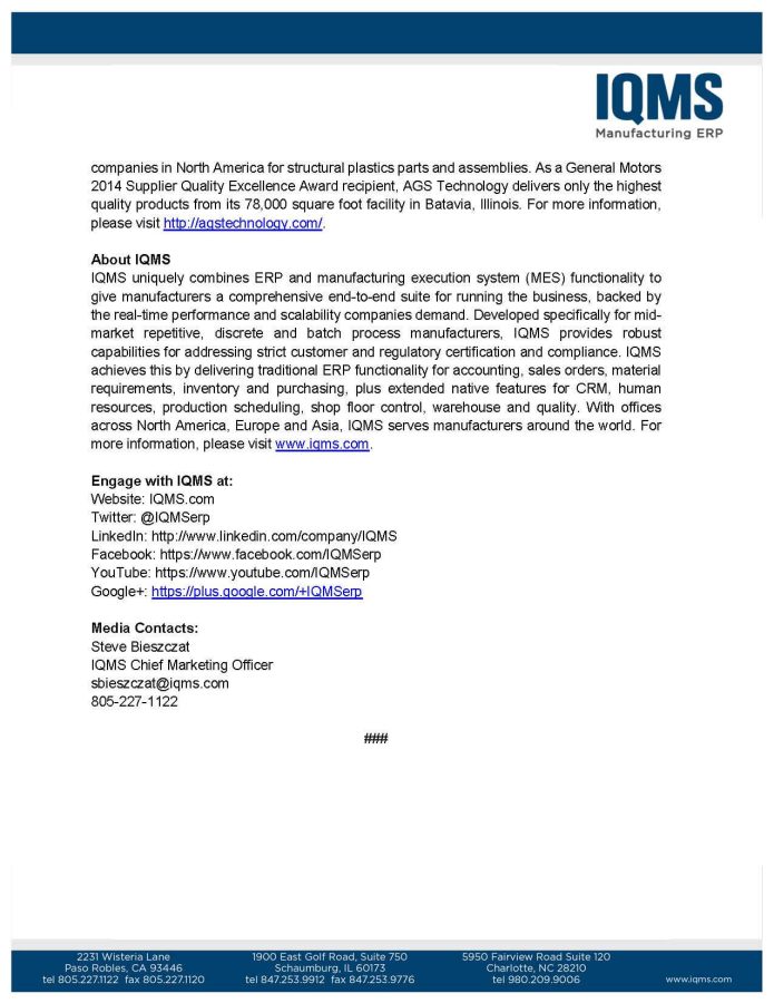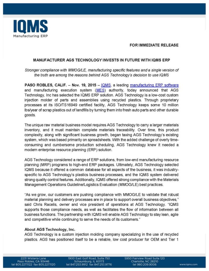 AGS Technology has kicked off ERP implementation and is well on its way to going live in Q2 2016. Below is the recent press release from IQMS: