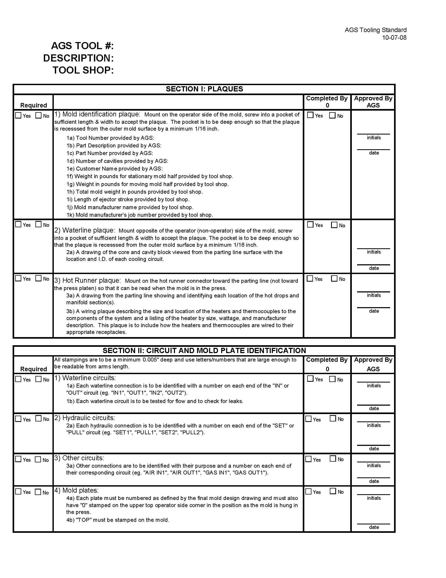 For new tools, AGS has developed its own tool standard that specifies mold build requirements. The AGS Tool Standard is a living document that captures good tooling practices and “lessons learned” for parts made from virgin or recycled materials. Every new tool managed by AGS Technology is checked against this tool standard to help ensure smooth part launches. Click on the following AGS Tool Standard (10-07-08) to view the latest pdf revision.